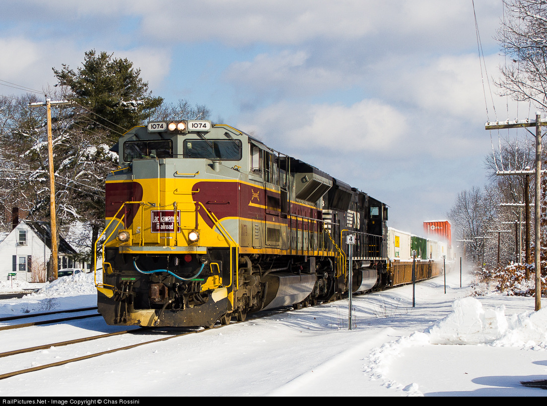 | NS 1074, the Lackawanna heritage unit, leads a 205 train past the Shirley MBTA station on a crisp winter morning. |