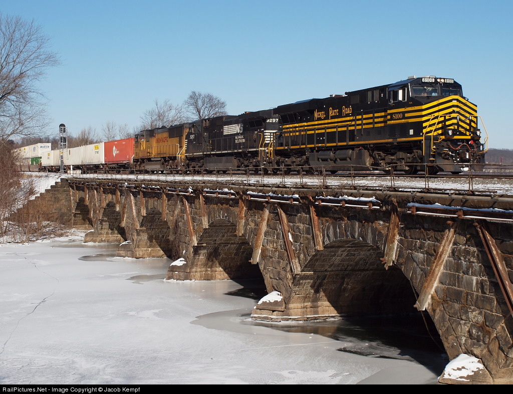 Norfolk Southern's Nickel Plate heritage unit leads stack train 26T over a frozen Sherman's Creek in Duncannon on a beautiful winter morning.