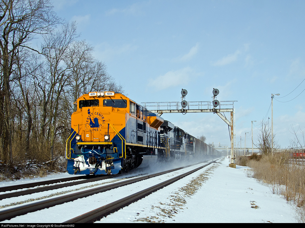 | It's tough to decide the more important subject of this photo...On a cold day in Central Kentucky, the orange and blue of the CNJ Heritage Unit provides a sharp contrast to the snow. 1071 is blowing through the last known remaining "untouched" former Southern Railway GRS Searchlight signals on the old First District of the CNO&TP at Delaplain, KY. Most of the new PTC signals have been installed along side the "old" signals thus ruining the shots of the old SCs. NS's large yard serving Toyota sits to the right of the photograph. |