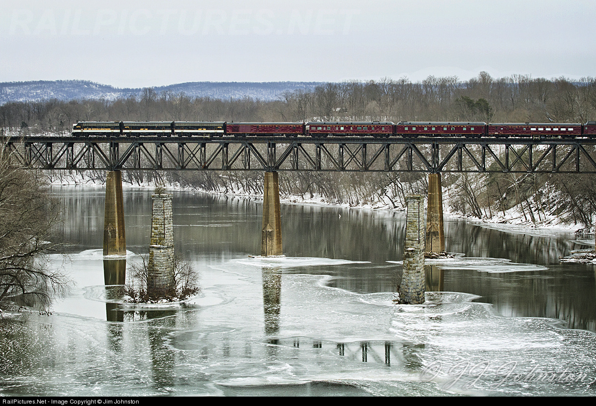The NS OCS with F9A unit NS 4270 and B units NS 4275 and NS 4276 cross an icy Potomac River from West Virginia into Maryland on the way back to Altoona after completing their first trip in 2014.