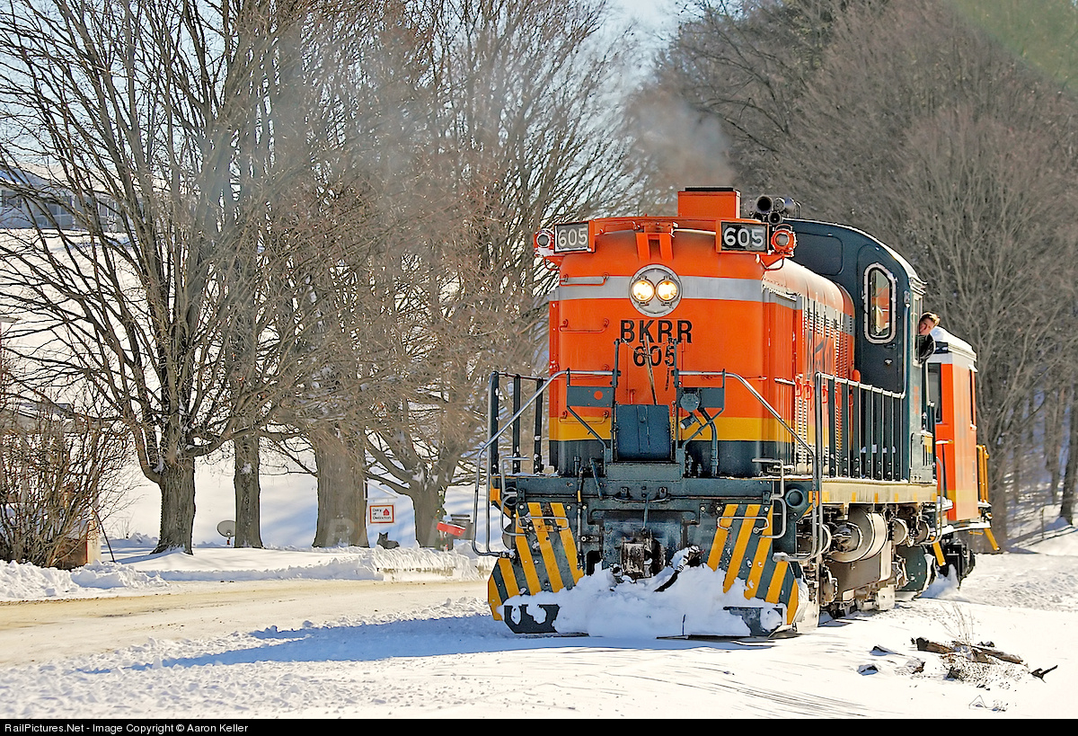 I don't always shoot into the light, but when I do, it's to produce a calculated effect such as this. The textures in this scene emphasize the zero-degree temperatures braved by the crew and by photographers this day. Here, the Batten Kill's "flagship" RS-3 bounces and burbles along past farmlands in Washington County, N.Y., as it pulls a flanger along the right-of-way after a snowfall. The railroad's owner is peeking out of the cab of the locomotive. At speeds of five miles per hour, it's slow going on this section of the line. Note the dog visible below the trees to the left.