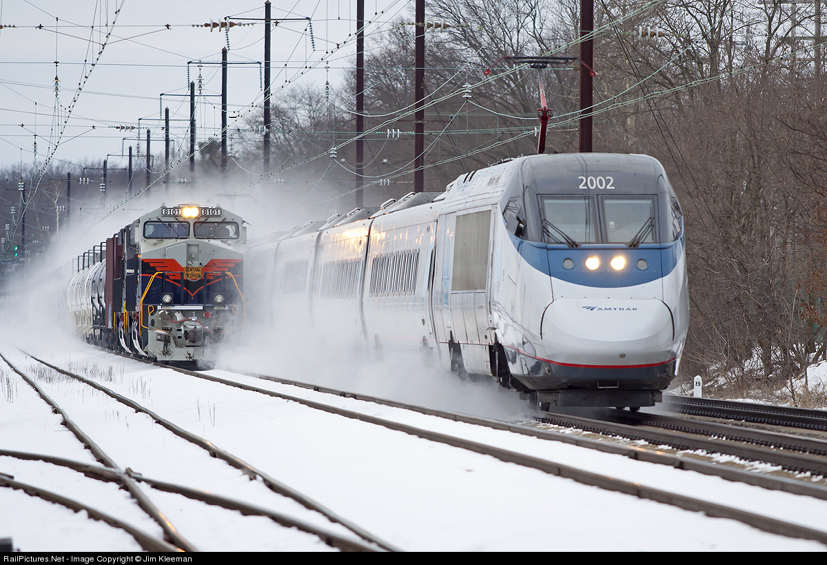 An NS oil train sits near Chrysler Yard, waiting for track authority to proceed down the Delmarva Secondary to the Reybold, DE refinery. Meanwhile Amtrak Acela 2256 speeds north towards Wilmington and dusts the Central of Georgia Heritage Unit with a fresh coat of snow.