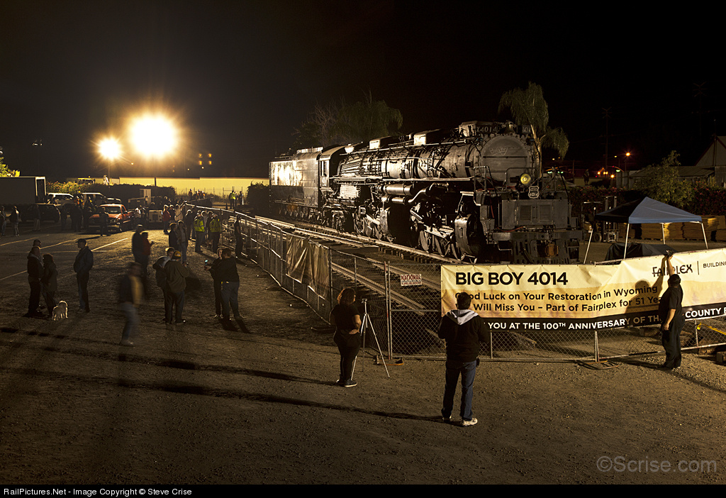 | January 25th, 2014. 4014 is just a few hours away before its departure from the Pomona Fairground after calling the Railroad and Locomotive Historical Society home for the last 52 years. Crowds that totaled several hundred people gathered to see the 4014 begin the journey to Wyoming. Veolia Transportation track crews are gathering in the background preparing the equipment necessary to cut and swing the rails to connect with the panel track. |