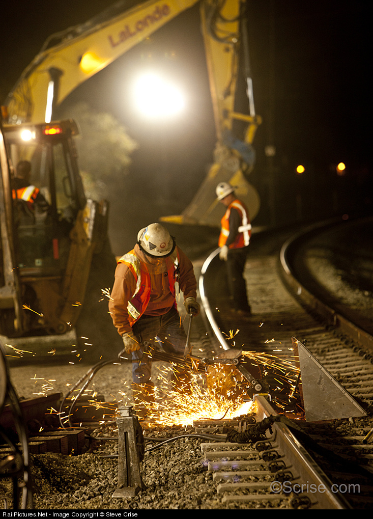 January 25th, 2014. Track crews begin slicing the rails of Metrolink's San Bernardino mainline in preparation of sliding them a few feet south to connect the panel track where the 4014 awaits to make its escape from the Pomona Fairgrounds. The 4014 has been displayed there for the last 52 years at the Railroad & Locomotive Historical Societies compound. The 4014 is being moved to Cheyenne, Wyoming for restoration and operation by the Union Pacific Railroad.