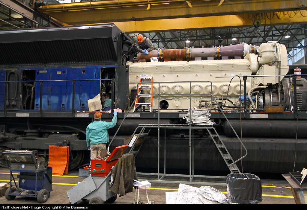 Even though Montana Rail Link EMD SD70ACe is just seven years old in this image, it is having its prime mover changed out with a new one from Electro-Motive Diesel. A new 4,300 horsepower EMD 16-710G3C is being installed inside MRL No. 4307 at MRL’s Livingston, Montana, shop on May 7, 2012. Hard use in helper service, in addition to extreme temperature differences during cold Montana winters and very hot Mullan Tunnel operating temperatures, surely exacerbated engine wear. Recent tunnel clearance rehabilitations have mostly eliminated the extreme temperature problems, so the SD70ACe locomotive fleet will likely get more milage on these new prime movers.