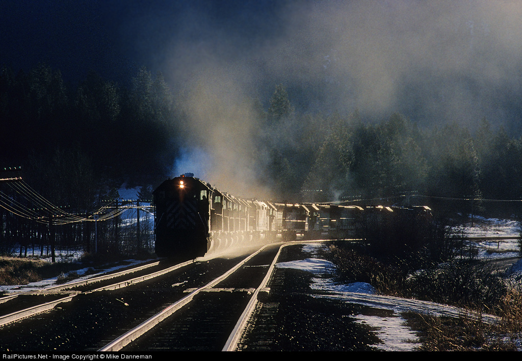 On Montana Rail Link’s Mullan Pass, fourteen locomotives head back to Helena, Montana, as a light engine movement on the afternoon of February 6, 1997. Two 4-unit helper sets, a 2-unit point helper and a set of four BNSF locomotives glint the evening sun at Austin. With all of that sand residue swirling into the sky, it looks like someone forgot to turn off a sander or two on some of the locomotives!