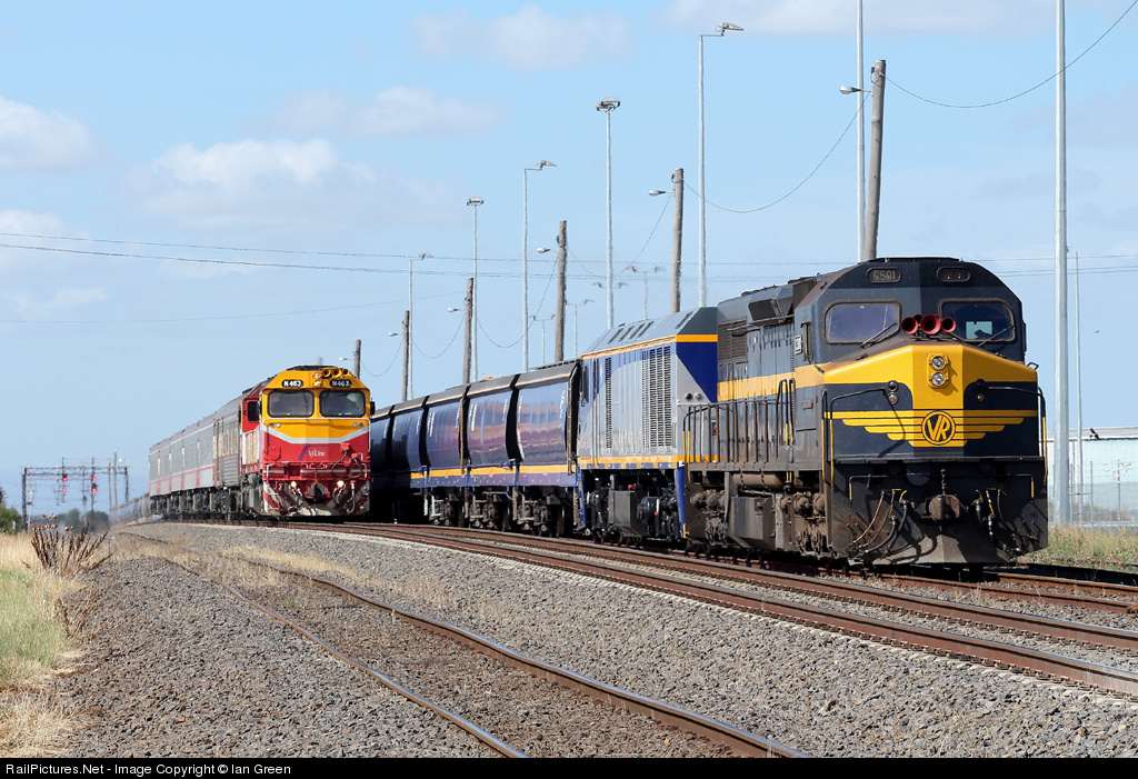 N463 with the 12.45pm up Albury pass overtakes a Qube grain consist led by C501-EL55 at McIntyre Loop.