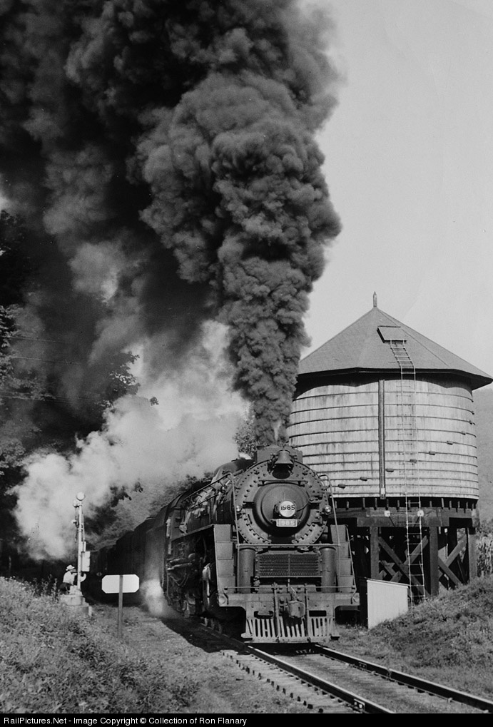 | This is one of my favorite L&N photos--taken by the late August Thieme. CV Division train 55--the overnight through freight from Corbin to Norton, VA--is blasting upgrade on the last three miles to its destination. Motive power this morning is M-1 "Big Emma" 2-8-4 number 1985, not more than a month after its construction by Lima-Hamilton. The 1985 was in the group of 22 of these magnificent locomotives built in 1949 (1970-1991). Two local guys are watching at the old US 23 grade crossing. This photo appeared on a cover of Trains Magazine not long after it was taken.