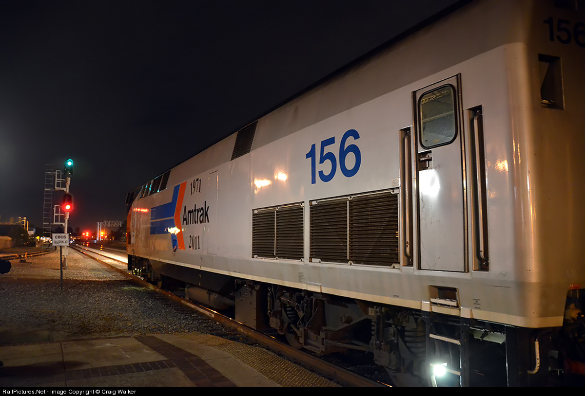 One of Amtrak's Heritage diesels, P42DC 156, is on the point of train #4 on the last day of January 2014. The train, the Southwest Chief, makes its first station stop after departing Los Angeles at Fullerton, California. Running about ten minutes late, the train will be departing for Chicago (and all the intermediate stops) soon.