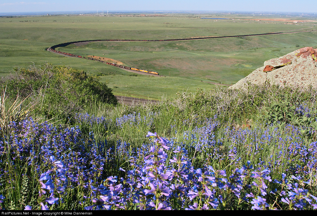 Ample springtime rainfall bring out the wildflowers among green grasses on the Front Range mountains in the foreground as a westbound Union Pacific coal empty departs Rocky, Colorado, after meeting an eastbound load on June 9, 2013.