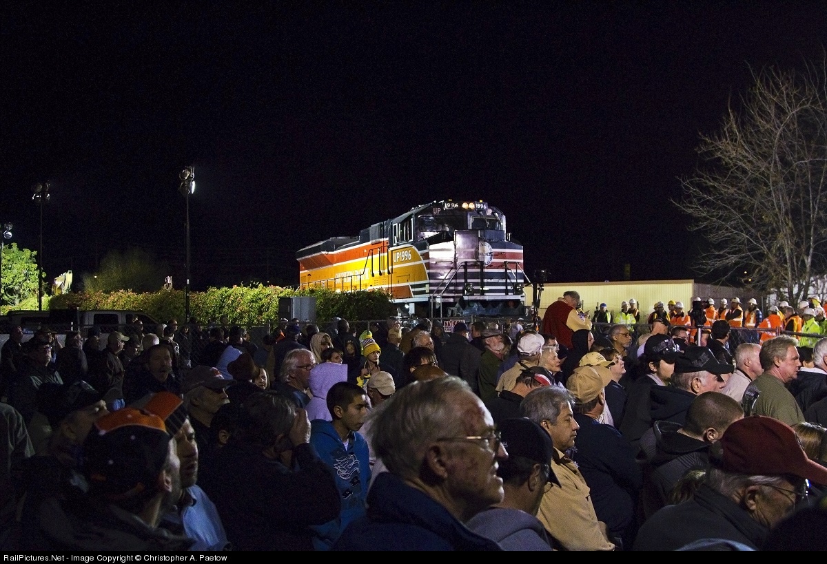 | Union Pacific's Southern Pacific heritage unit #1996 arrives at the LA Fairplex at 1:30am to pick up the UP 4014 for it's first mainline move in over 50 years. UP 1996 slowly pulls forward through a sea of railfans with cameras to couple up to the 4014. |