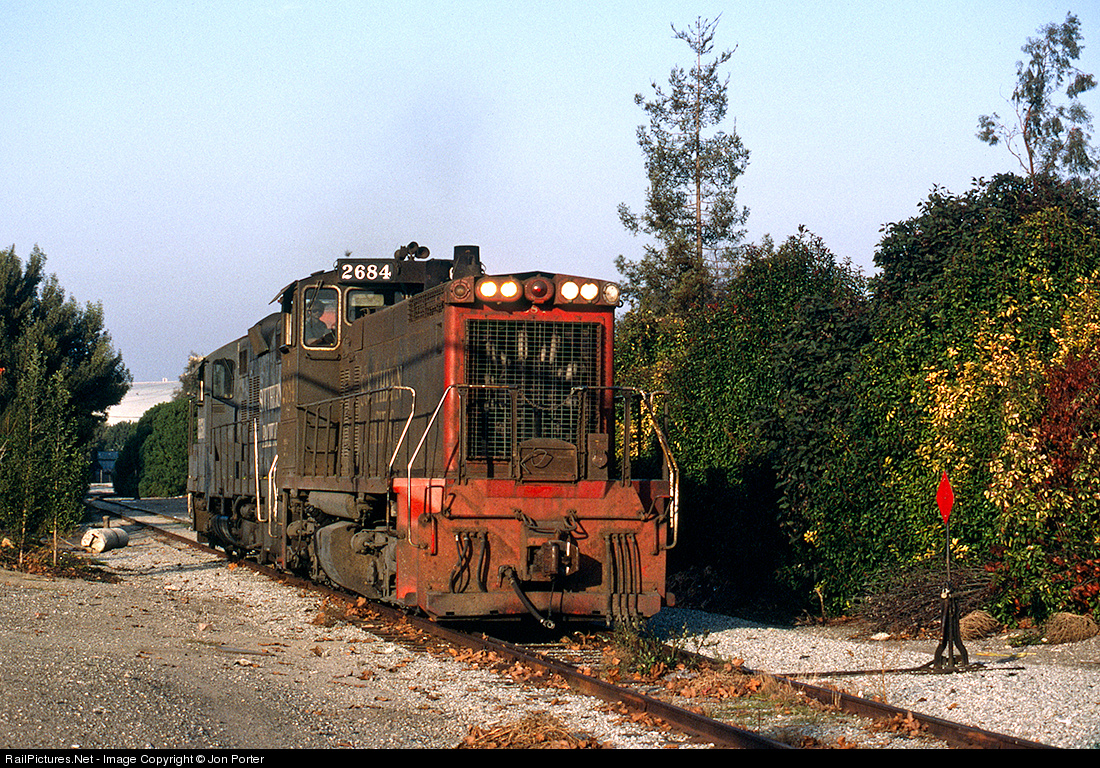 Southern Pacific's Broadway Local power, consisting of SW1500 2684 and GP9E 3350, return to the main line and their train in Mountain View, California, after delivering cars to Moffett Field Naval Air Station on Dec.4, 1988. The mile-long Moffett Field Spur also served several industries before they were replaced by high-tech offices. In 1994 the Navy left the air field and the spur fell into disuse until 1997, when the SP tracks were pulled up and the right-of-way became part of the VTA light rail extension. Today trolleys run on a double-track line through here. Kodachrome 64