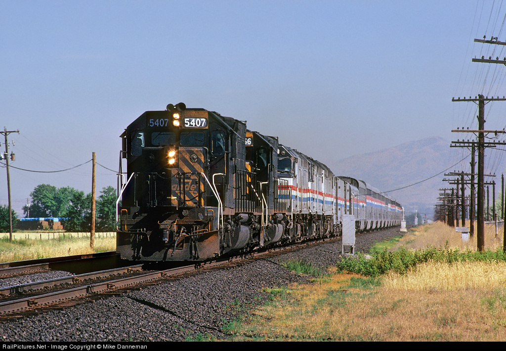 T-Motors on the Zephyr Amtrak’s eastbound California Zephyr has some extra power in the form of two Rio Grande Tunnel Motors on July 7, 1988, as the train flies through Geneva, Utah. EMD SD40T-2s Nos. 5407 and 5366 help three F40PHs (one or more possible failing) with the long train that includes two private cars on the rear.