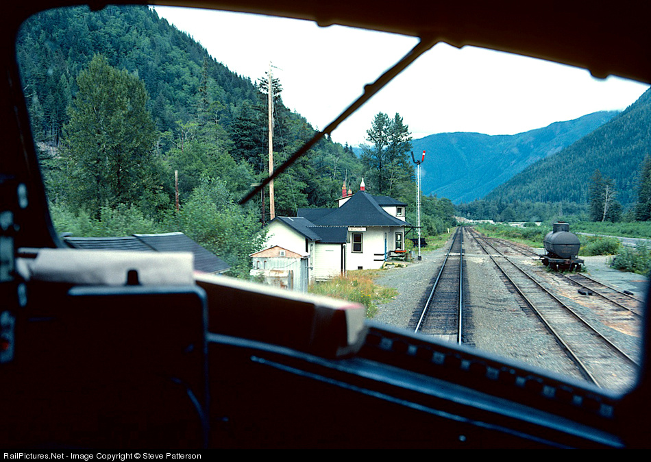 | Two days later (than the previous photo) as seen from the engineer's viewpoint VIA's Train 10 also has a clear train order board and will sail by Kwinitsa without stopping on Aug. 5, 1981. Nos. 9 and 10 "Skeena" operated 720 miles between Jasper, Alta. and Prince Rupert on the coast. |