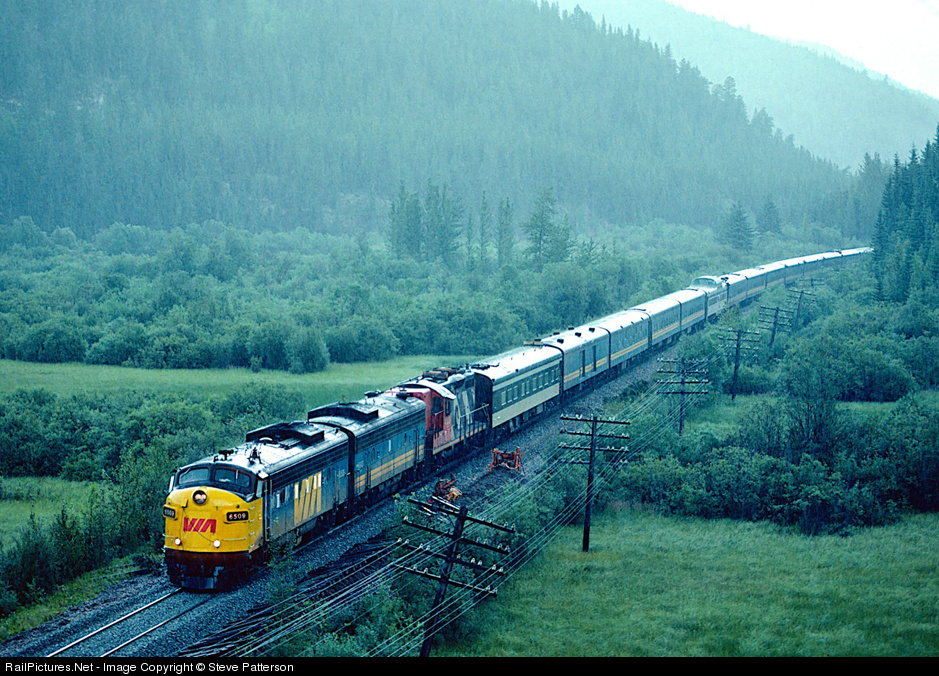 After departing Jasper, westbound VIA Train 3 is nearing the Alberta / British Columbia border in a downpour on July 29, 1981. An office car is first behind the EMD's. The lead F carries the first of Canada's edict for trains to have ditch lights, an idea that was subsequently adopted in USA.