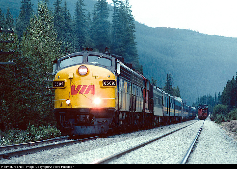 VIA Train 3 took the siding to allow an eastbound freight to hold the freshly-ballasted mainline at Decoigne, Alta., July 29, 1981. F unit 6509 carries the first of Canada's edict for trains to have ditch lights, an idea that was eventually adopted in USA.