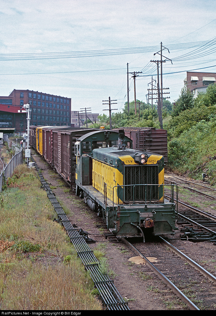 | CNW 1281 one of two SW600s on the CNW (the other, 1280 also served Eau Claire) does some switching outside the Uniroyal tire factory at Eau Claire tower. The shot taken from the tower shows No. 1281 on the eastbound main as well as the piping used to operate turnouts and signals at this location. The Milw. Rd. boxcar in back of the engine is on the interchange track. |