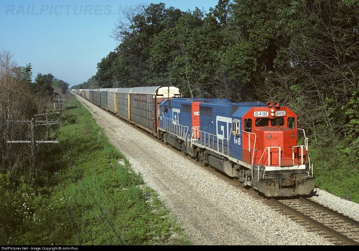 Eastbound GTW freight #370 led by two GP40-2's (both ex DT&I) roll auto carriers and manifest E. of Chamberlains, MI. The seventeen mile stretch of GTW mainline between Penn and Schoolcraft was single tracked in 1988 and evidence of the missing second main track can be seen in the foreground.