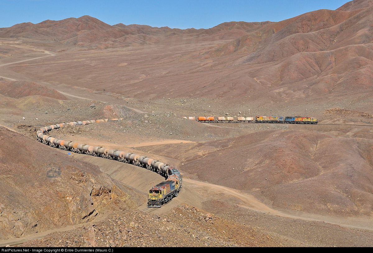 | Triple traction in front and two helpers locomotives in end of FCAB acid train, up to hard slope from Mejillones seaport to great CODELCO Chuquicamata copper mine, by Cumbre Pass. |