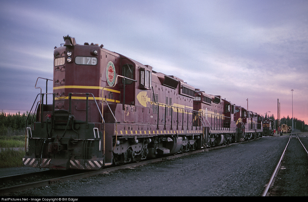 | Two pairs of SD18/SD9 combos in two color schemes bask in the evening light while SD38AC No. 204 looks on in the background at Keenan Yard on the DMIR at Forbes, Minn. DMIR 176 is an SD18, DMIR 164 and 167 are Phase IV SD9s. Another SD18 is coupled to No. 167. The "arrowhead" scheme began slowly replacing the original scheme about 1970. |