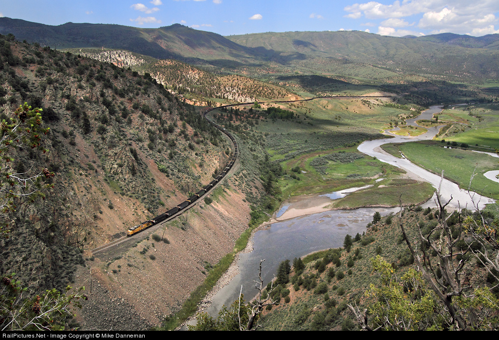 An eastbound Union Pacific coal load has just exited Little Gore Canyon along the Colorado River west of Azure, Colorado, on June 6, 2013. The lead locomotives are in the distance snaking their way toward the west switch at Azure, while below, the rear DPU has just emerged from Tunnel 39.