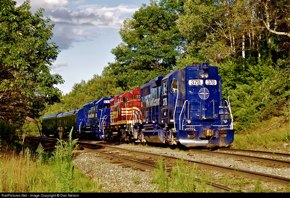 | The first ever appearance of Boston & Maine heritage unit 77 out of the Waterville shops after being painted into the old maroon scheme. Just west of Leeds Jct. while waiting for a meet with an eastbound, the old GP9 rests between 378 and 613. |