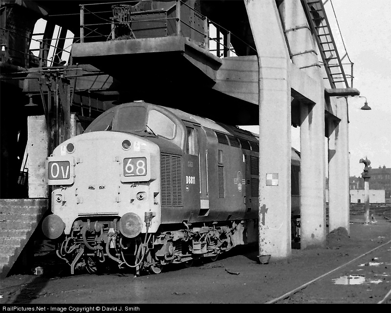 Built by English Electric,and introduced in February 1963,Class 37 No. D6811 stands underneath the coaling stage at Saltley depot,Birmingham,in March 1969.Although steam use had ceased the previous year,many artifacts from the age were still standing,some for many years later.The coaling stage here was demolished not too long after this picture was taken.