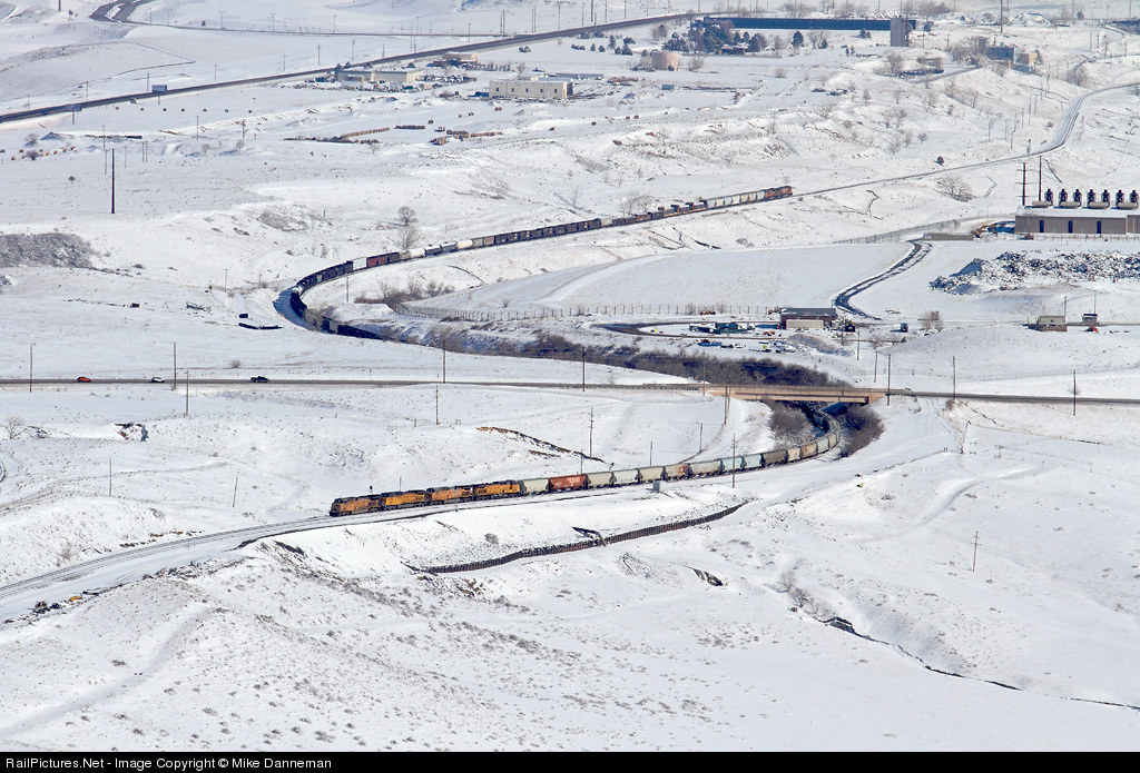 Adding meaning to the phrase “S curve, ” Union Pacific’s Denver to Salt Lake City manifest freight MNYRO climbs the two-percent grade into Rocky, Colorado, on February 2, 2014. Four GE AC4400CWs power the freight, along with two more locomotives operating as a rear DPU. The train is passing under Colo. Hwy. 93 and is surrounded by a fresh winter snowfall.