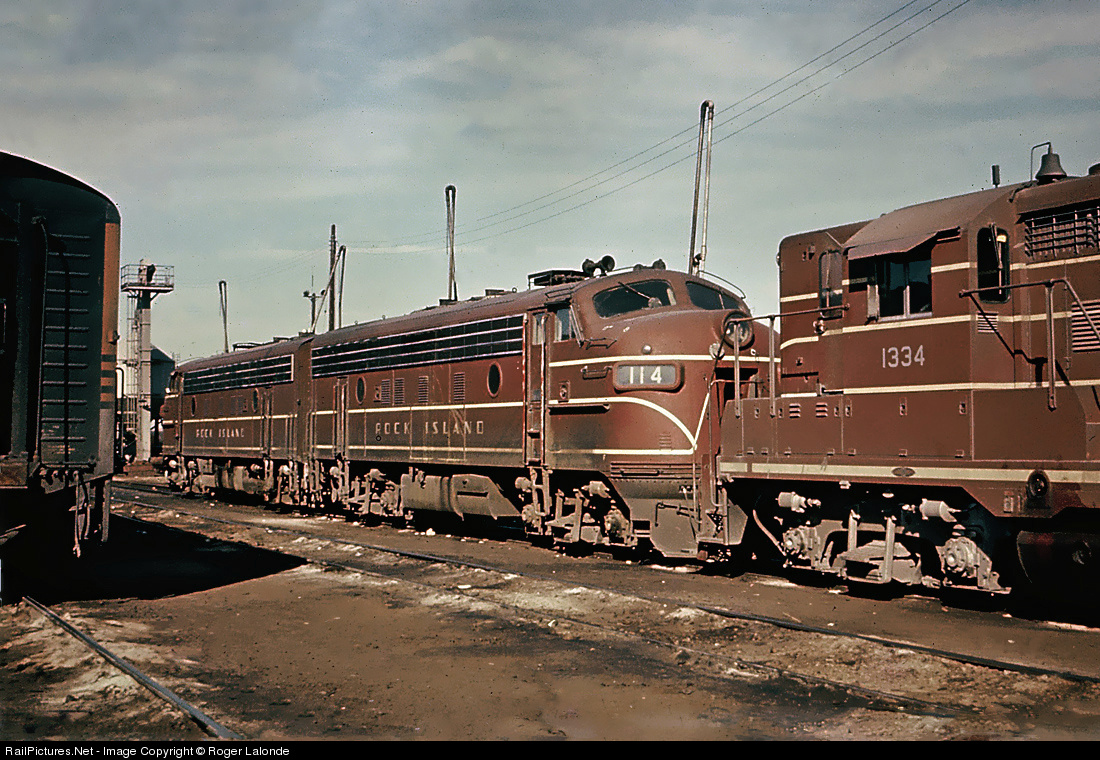 Tenant Rock Island F7(A) #114, with F7(A) #127, and GP18 #1334 in full pin striped paint scheme, share North Yard space with D&RGW F7(A) #5604. Photo from my slide collection, photographer unknown.
