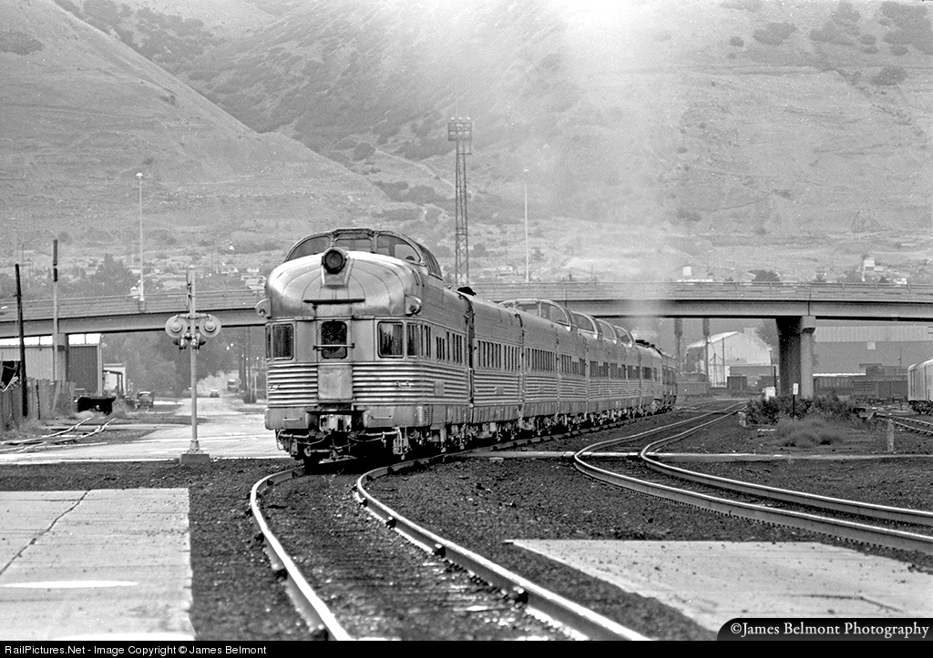 The Rio Grande Zephyr train No. 18 departs Provo station for Spanish Fork Canyon, Soldier Summit, Price Canyon and points east. Scanned from a Kodak Plus-X negative exposed through a 35mm Canon FT camera. Sept. 1975