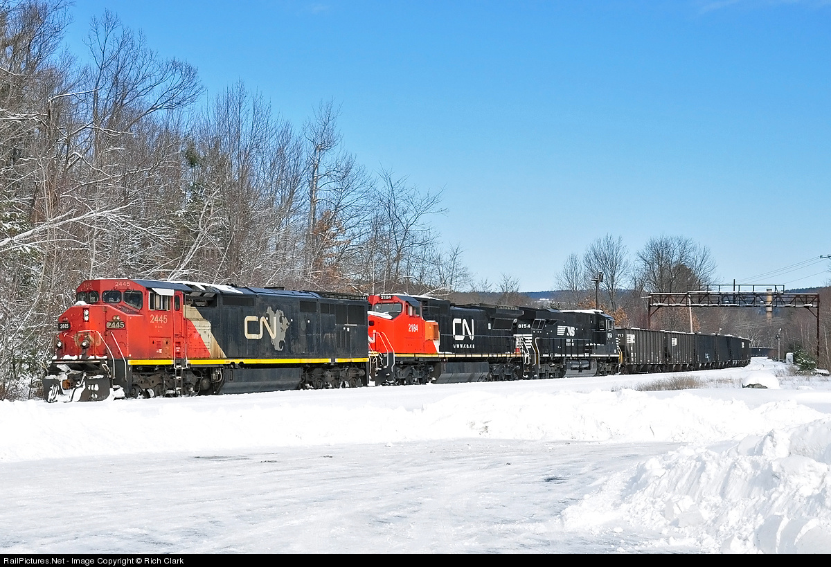 Empty coal train sits on the hill waiting for a crew with a newcomer to the area as CN 2445 is on the point making for a nice change to the normal NS newer power after a day of more snow here in the northeast.