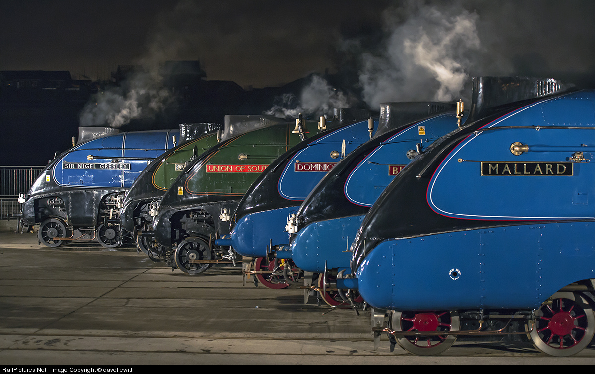 The Great Gathering is underway. All remaining 6 A4 class locomotives together for the last time in the yard at Locomotion, Shildon. The offshoot of the National Railway museum in York. Next week 2 of these locomotives will be on their way back to North America and probably never seen again, not in my life time at least, so enjoy whilst you can.
