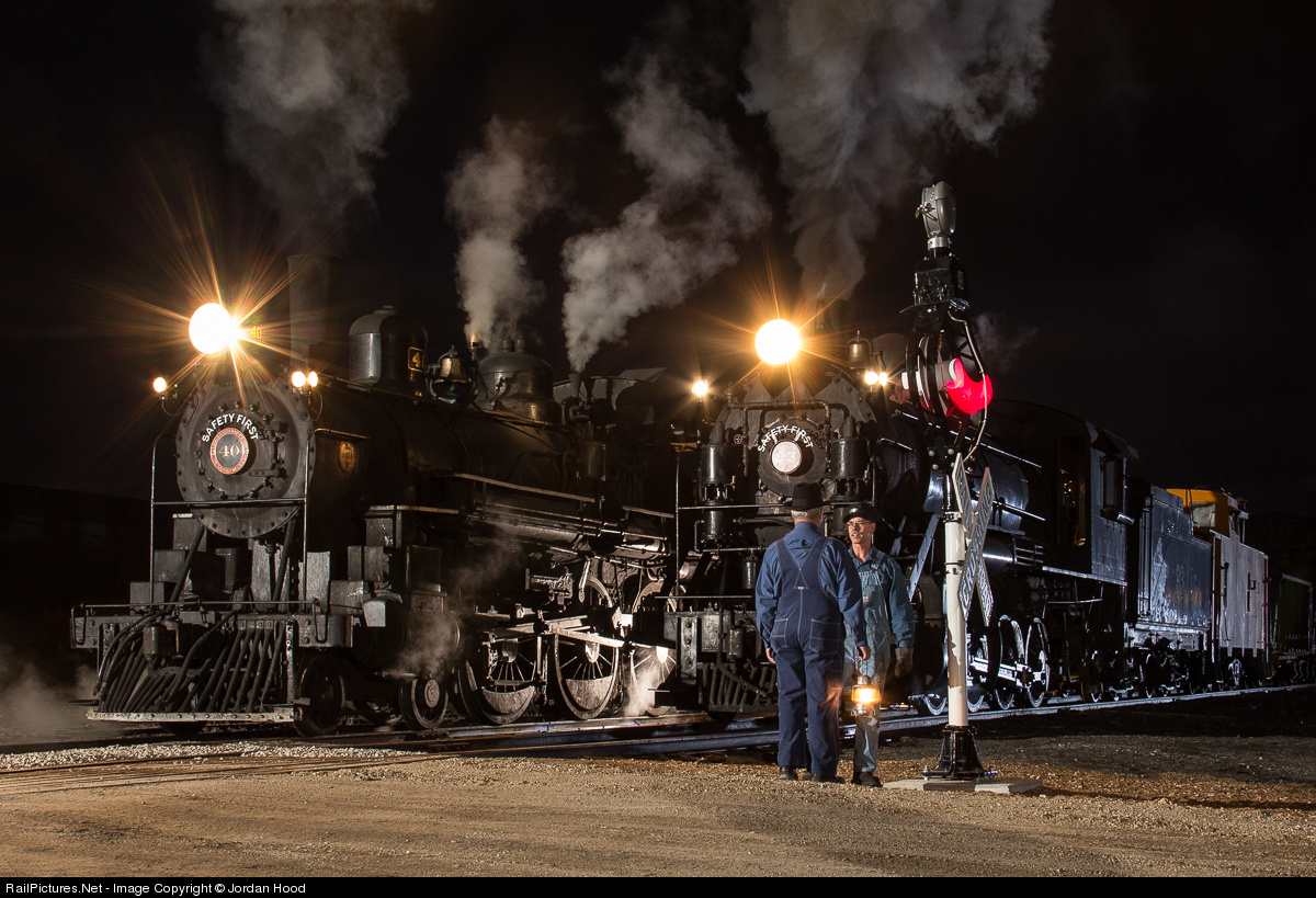 A couple of railroaders talk about their next moves in front of the newly installed wig-wag signals while the high drivered 4-6-0 and stout 2-8-0 simmer on the mild winter night.