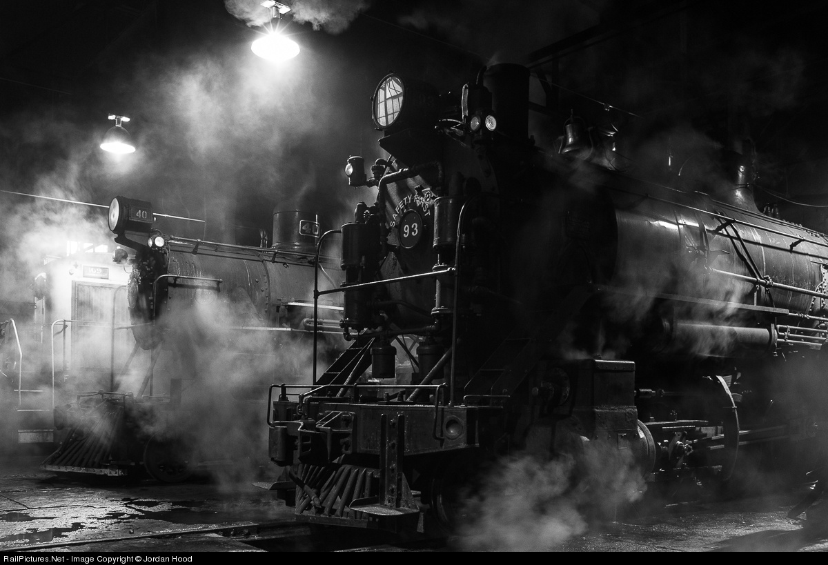 | Dawn light from the windows above the shop reflects off the high mounted headlight of #93, while a thick cloud of steam dissipates over the roundhouse following a blowdown by the stout consolidation. |