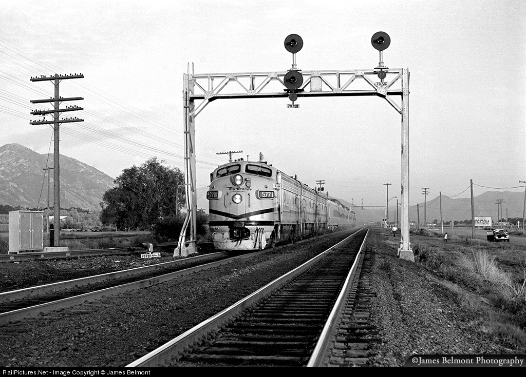The Rio Grande Zephyr train 17 roars west through the dual signal bridges at Geneva on June 28, 1975. Only 43 miles remain of the 575 mile journey from Denver to Salt Lake City.
