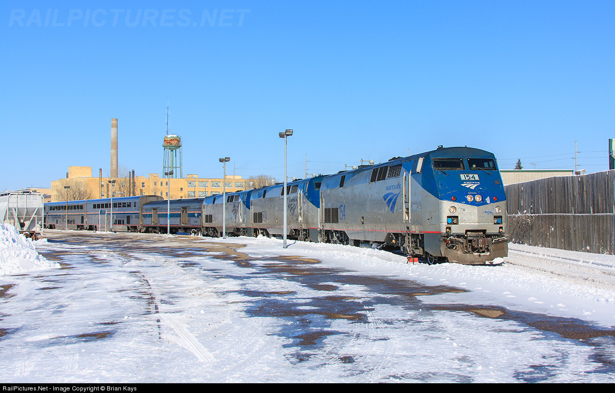 The Empire Builder departs after performing a pretty quick 13-minute station stop at St. Paul's Midway Station. Amtrak employees at Midway estimated to the riders waiting in the waiting area that the train would arrive at 1:00pm, then got pushed back 1:17pm, then 1:25pm due to a BNSF train blocking a clear path at St. Anthony. As soon as that cleared an Amtrak staff member came over the intercom system with a regretful tone, "looks like there is yet anther BNSF train, this one is a container train and will change crews. Again, sorry for the delays and we thank you for your patronage." Around 1:55pm the Empire Builder poked the nose of the lead locomotive 154 at the south end of the Minnesota Commercial A Yard waiting for a Minnesota Commercial employee to come align the powered switch to the station platform. Finally at 2:00pm the train came to a stop for the MSP station stop. A frustrating series of event for Amtrak, nearly an hour of delays within a half mile of the station.
