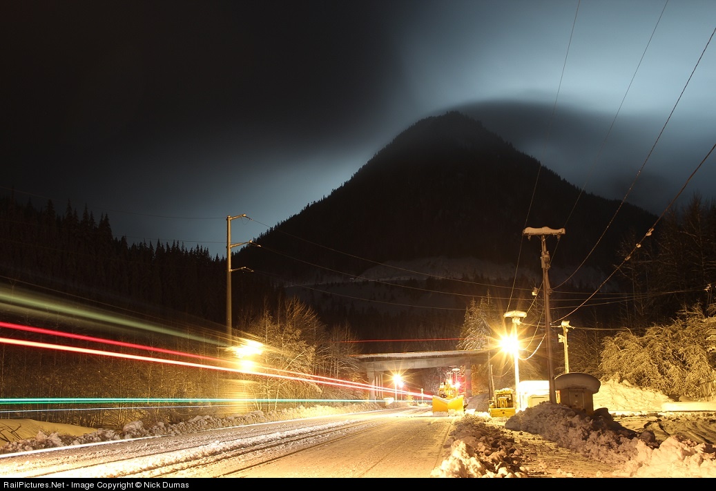 | The lights of Stevens Pass Ski Resort illuminate the sky as Amtrak's eastbound Empire Builder #8 continues it's journey east and is about to enter the 7.8 mile long Cascade Tunnel. Off in the distance, you can see Highway 2 climbing along the mountain side. |