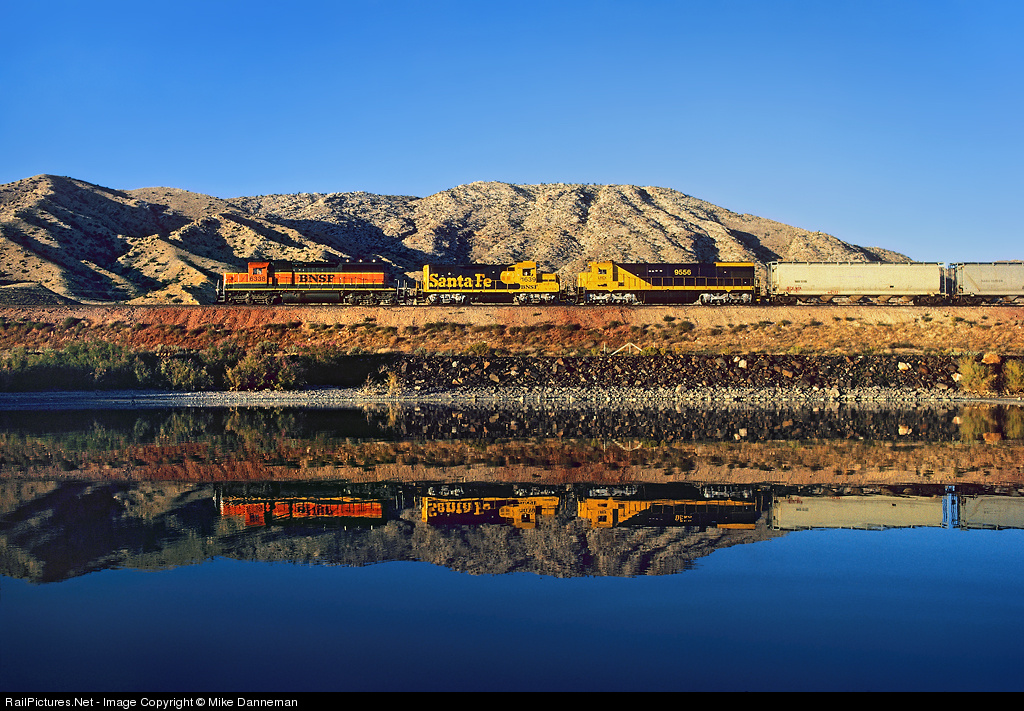 Reflecting the last moments of bright sunshine on September 1, 1998, Burlington Northern Santa Fe freight MPUELAU (Pueblo, Colo. to Laurel, Mont. manifest) glides along the calm waters of the Boysen Reservoir just before entering the shadowed depths of Wind River Canyon west of Piper, Wyoming. The colorful, eclectic “all former Santa Fe” motive power for the train is EMD SD40-2 “snoot” No. 6338 in Heritage I paint, an EMD GP7 No. 1639 still dressed Santa Fe, and GE LRCX (Livingston Rebuild Center) No. 9556, a former U36C rebuilt by Santa Fe into a SF30C.