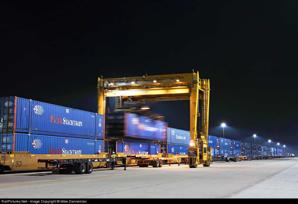 Union Pacific Mi-Jack No. 91004 smoothly loads the last Pacer Stacktrain container onto a long string of well cars at Joliet Intermodal Terminal (also known as Global IV) at Joliet, Illinois, on the night of November 9, 2010.