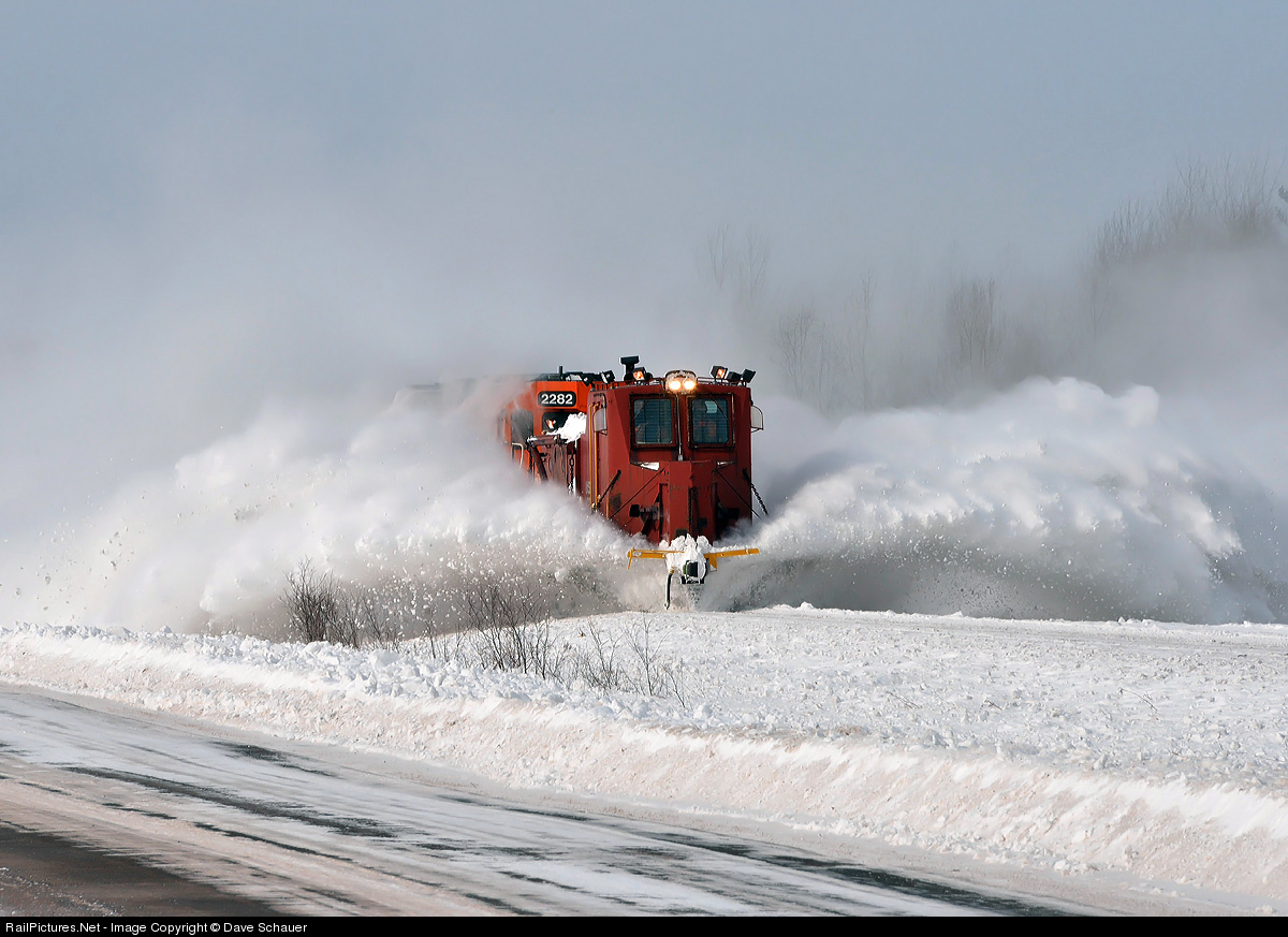 | A former GN snow dozer (BNSF 940022) deposits a nice collection of snow and ice chunks on Wisconsin County Highway C as it works east. BNSF's dozers have been busy clearing compacted snow and ice from mainlines. |
