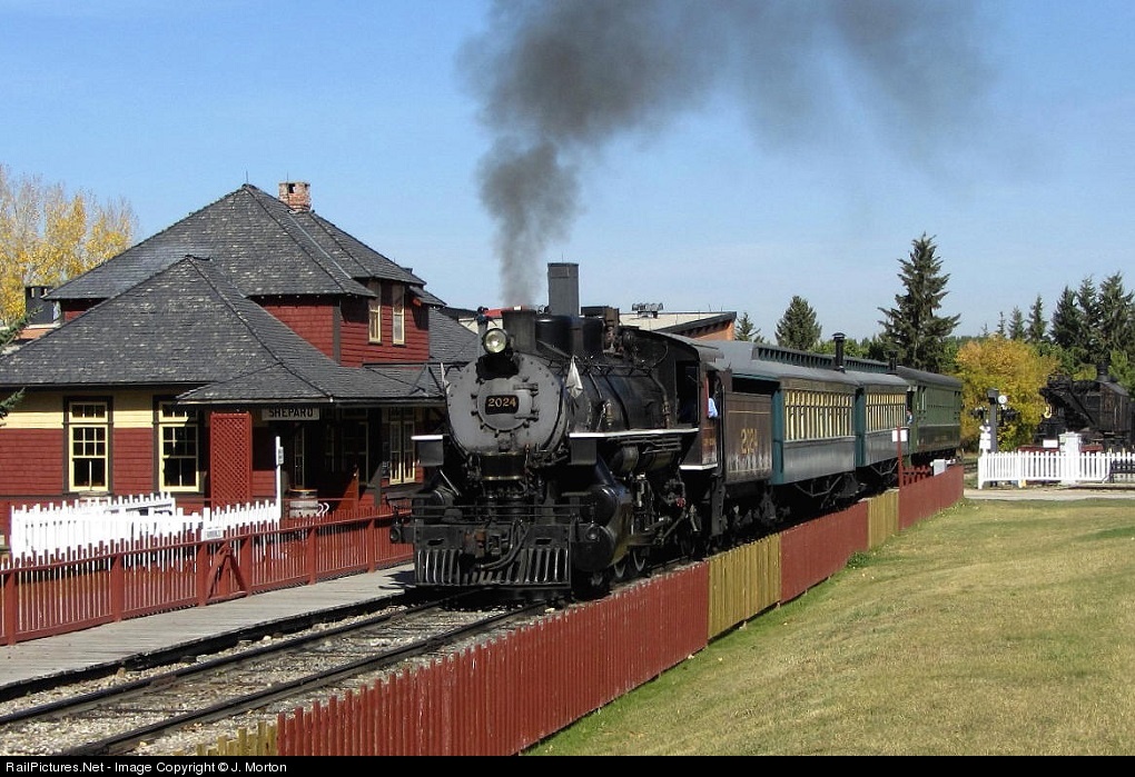 | The local steam passenger train pulls up to the Shepard Station on a beautiful autumn day.The station name comes from the name of the contractors that built the 'Prairie' section of the Canadian Pacific. Langdon and Shepard built the section from near Brandon to Calgary.(Approximately 630 miles). |