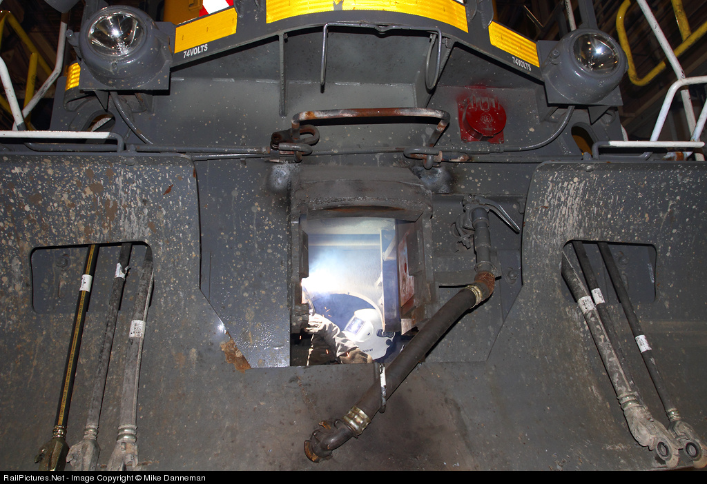 A welder works at repairing the worn draft gear area in the front of Union Pacific No. UPY 697 at the capable Kansas City Locomotive Facility in K.C., Missouri, on October 21, 2013.
