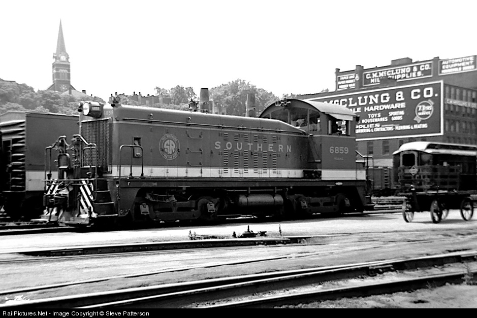 Marker-light equipped Southern EMD SW-7 switcher 6859 was assigned the passenger station at Knoxville, Tenn. when this image was snapped on June 28, 1957. The church tower clock says 2:28; the heavyweight pullman was allocated to the CNO&TP while the switcher was on NO&NE’s roster. ( Editorial Note: the McClung Warehouses in the back ground burned, for the second time recent history, in 2014 and have since been demolished. See www.railpictures.net/viewphoto.php?id=468677 )