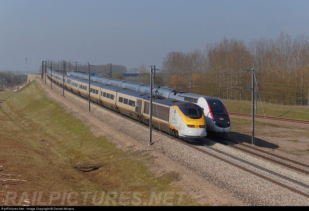 Both high speed trains are crossing at 250 Km/h. We can see that the Eurostar trainset is longer than the double deck trainset in backgroung. The Eurostar can be cut in half for safety issue in the Channel Tunnel, the half train becomes autonomous in this case to go out of the tunnel from the side where there is no problem (in case of fire for example) ! The specific Alstom TGV technology is that each passenger car lies with a single and common bogie and each car is "coupled" with those around and form an inseparable train. That the reason because Alstom high speed trainset are the most secure trains in the word. The Eurostar, on the center of the trainset, have cars with double bogies.