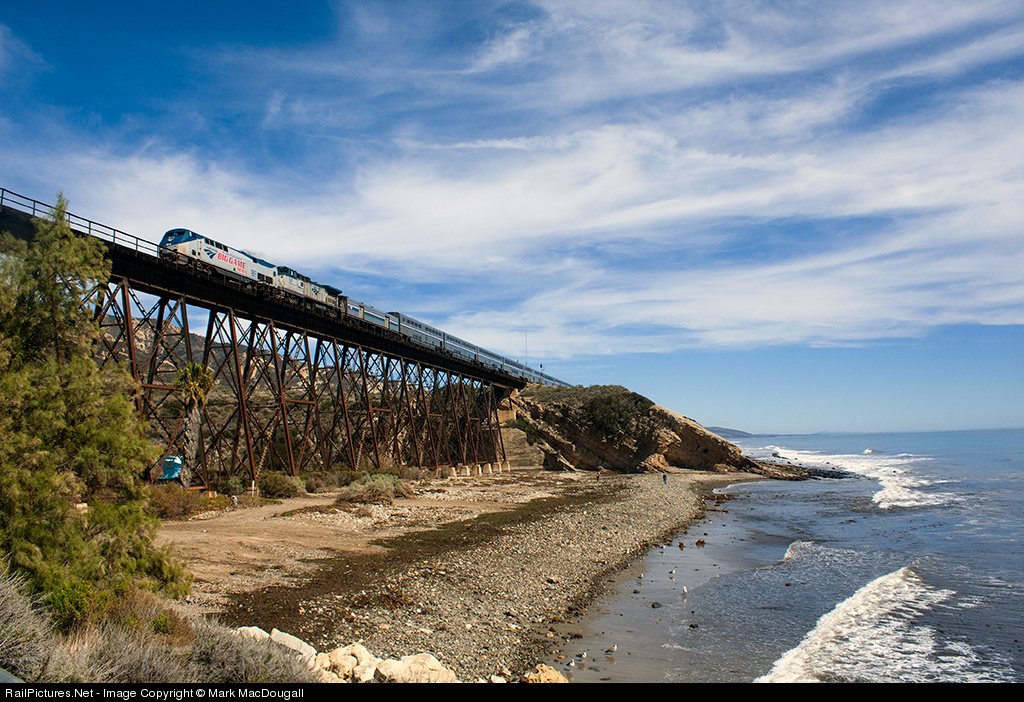 Amtrak 14, the NB Coast Starlight, heads over the trestle at Gaviota behind a P42 lettered for "The Big Game Train" and a B32-8. Unfortunately, the classic pier at this location which made for a great prop was damaged by a storm earlier in the month.