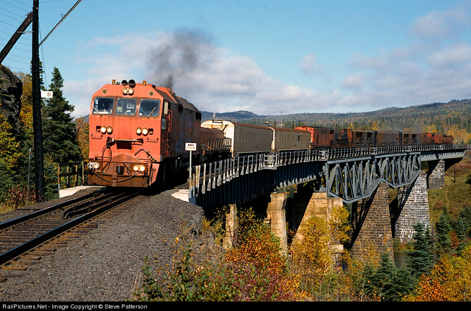 RMS-14 Speno Rail Grinder train is hustling to its next assignment across Canadian Pacific’s Little Pic River bridge near Middleton, Ontario, Oct. 4, 1997.
