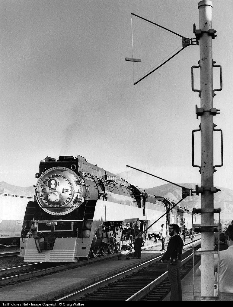 On May 12th, 1981, Southern Pacific 4449, a GS-4 class 4-8-4 (owned by the city of Portland, Oregon), leads a short officer special eastbound through Mojave, California, after conquering the crossing of the Tehachapi Mountains. The trainorders on the hoops are yet another then-common railroad practice that would not last much longer. The Santa Fe Railway has trackage rights over this section of the Southern Pacific, between Mojave and Bakersfield, and the orders in the hoops are for Santa Fe 5168, a westbound due past the depot soon.