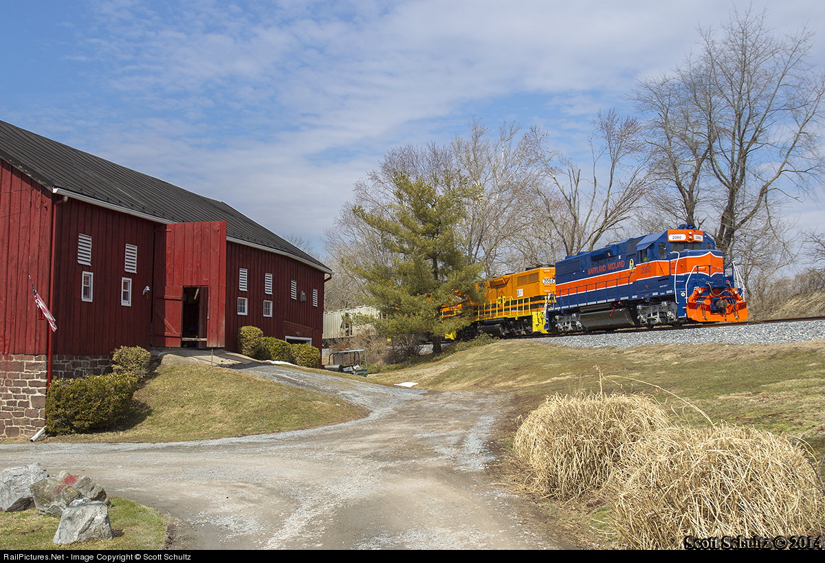 | MMID 2060, the Maryland Midland heritage unit, leads the eastbound UBHF. **Note: Taken with permission from land-owner.** |