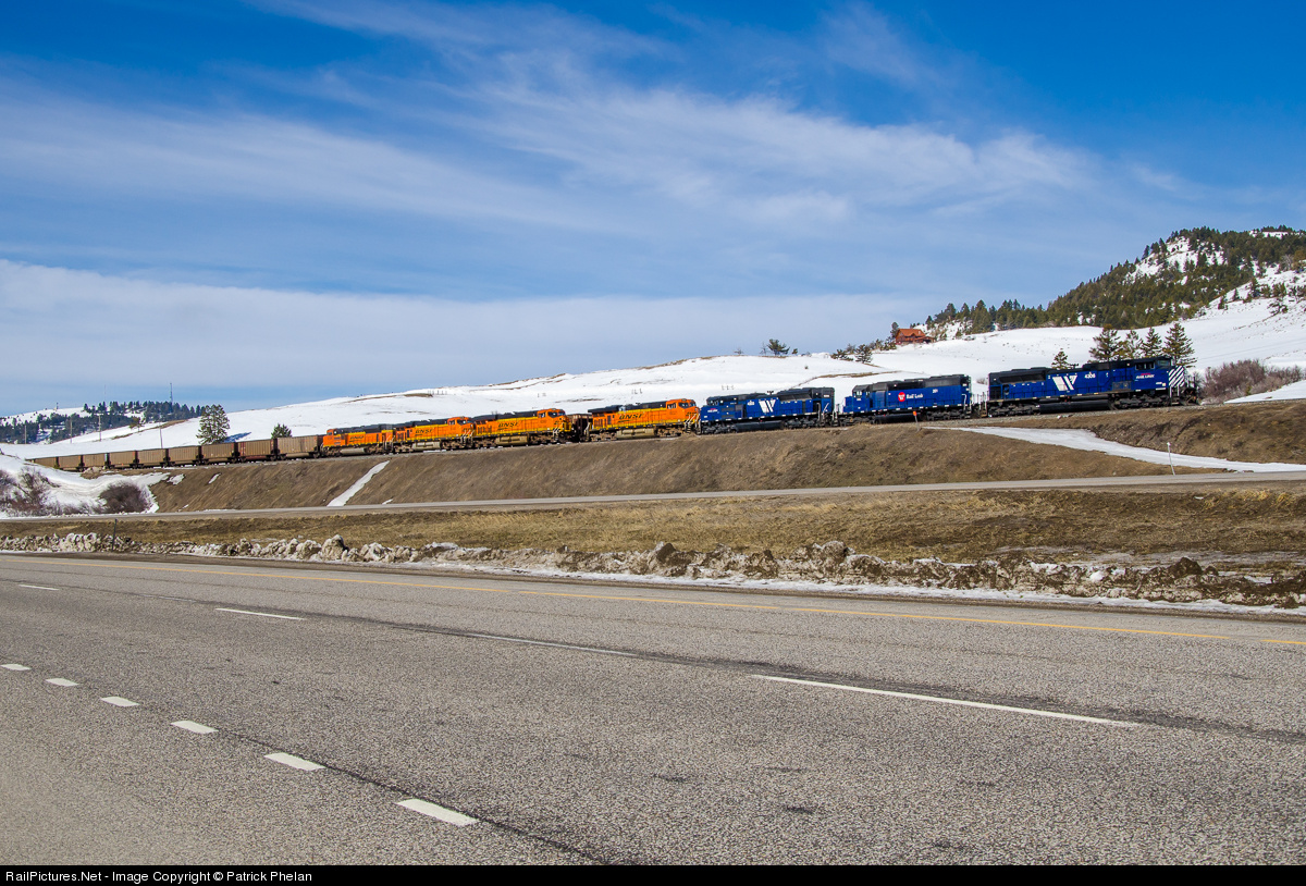 A MRL helper set shoves a loaded coal drag over Bozeman Pass while an eastbound empty waits in the siding to proceed down the mountain to Livingston and beyond.