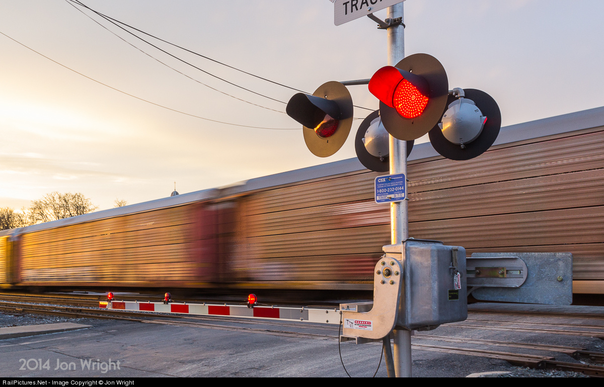 Racing to beat the curfew, the setting Sun lights the empty racks of Q261 racing through Brunswick, MD at the end of this mild late Winter day.